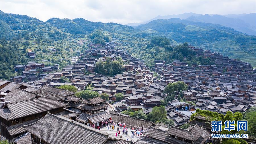 7月31日,游客在雷山县西江千户苗寨景区游玩(无人机照片)。 夏日时节的贵州省雷山县西江千户苗寨风光秀美,吸引游客前来观光游玩。 新华社记者 陶亮 摄
