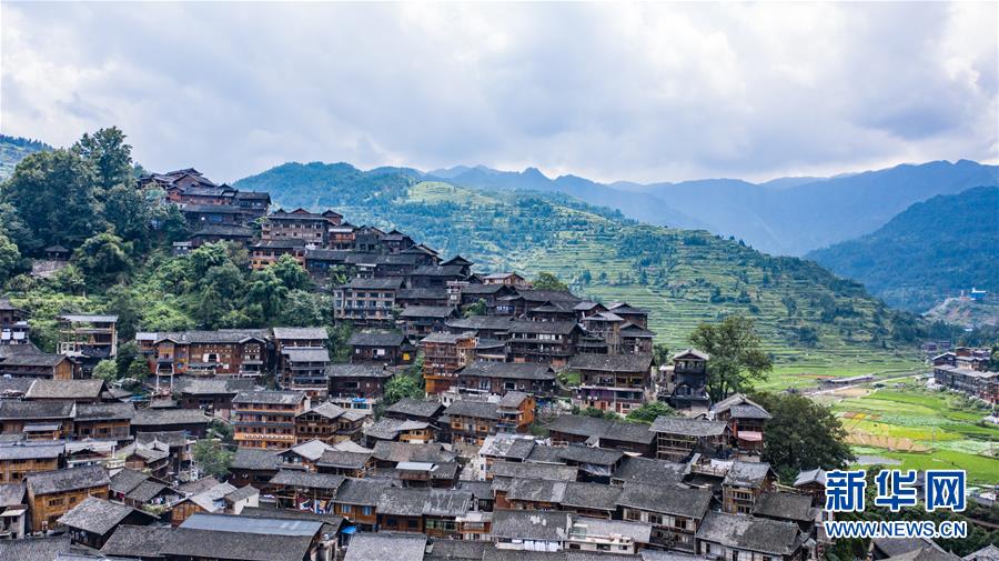 7月31日拍摄的雷山县西江千户苗寨景区风光(无人机照片)。 夏日时节的贵州省雷山县西江千户苗寨风光秀美,吸引游客前来观光游玩。 新华社记者 陶亮 摄