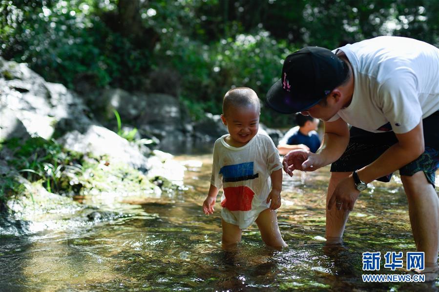 8月3日,家长带小朋友在杭州九溪景区的溪水中戏水。新华社记者 黄宗治 摄