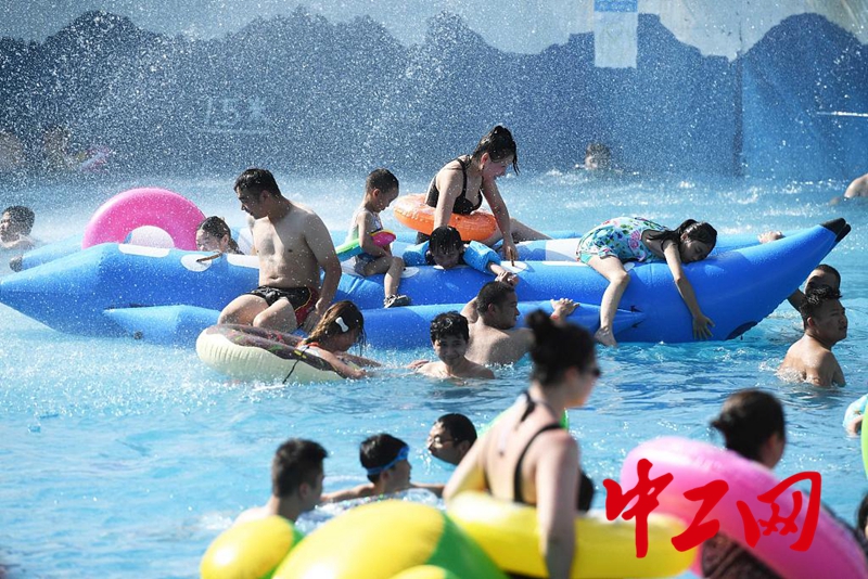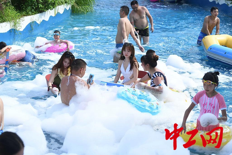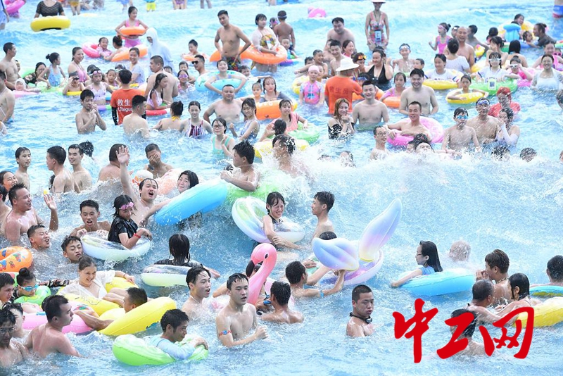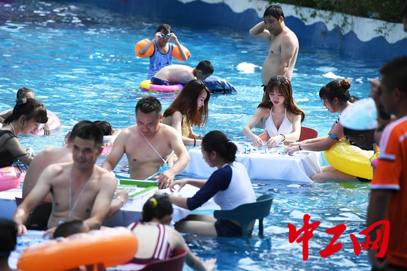 2020年8月3日,民众在水中打麻将、玩泡泡消暑。当日,重庆持续高温天气,涪陵红酒小镇水上乐园举行夏季消暑活动。图片来源:陈超(重庆分社)/中新社/视觉中国