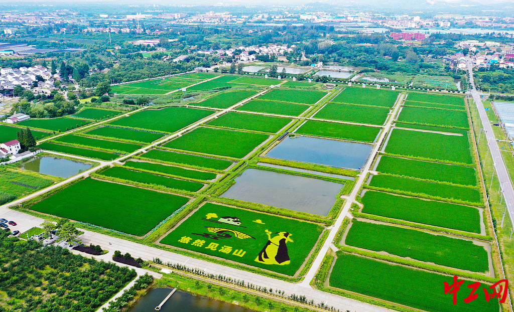2020年8月3日,一幅创意十足的稻田主题画亮相江宁汤山阜庄村。该稻田画主要包含了汤山阜庄石地水乡、道婆庵古村文化的标志性元素,并引用借鉴陶渊明的诗词,营造出一种特色田园乡村生活景象。冯芃/视觉中国