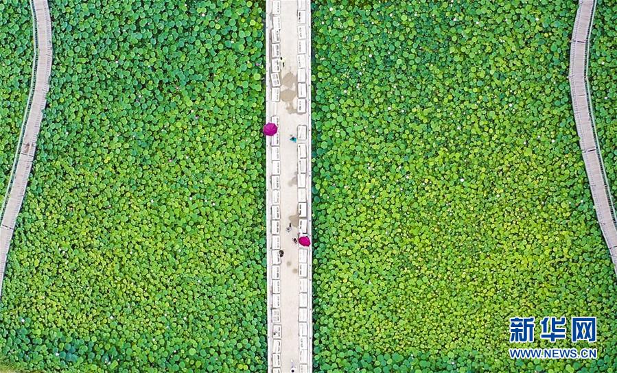 8月6日,游客在河北省永清县里澜城镇金华湖观赏荷花(无人机照片)。 夏日时节,河北省永清县里澜城镇金华湖荷塘的荷花争相开放,吸引市民和游客前来游玩观赏。 新华社记者 李晓果 摄