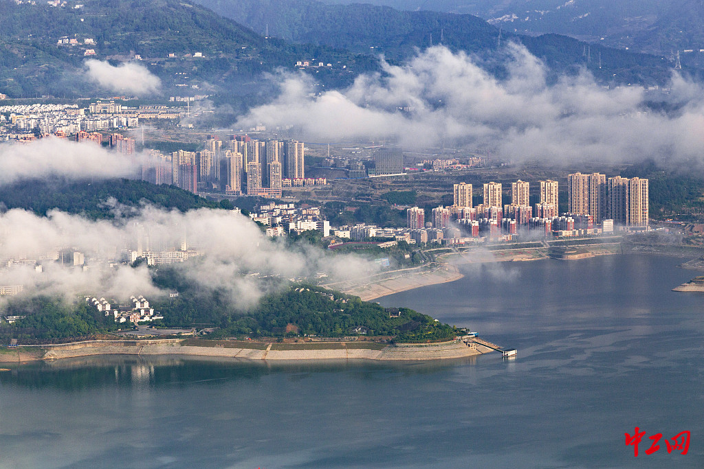 三峡大坝前的湖北省宜昌市秭归县屈原故里风景区笼罩在晨雾中,若隐若现。东来西往/视觉中国
