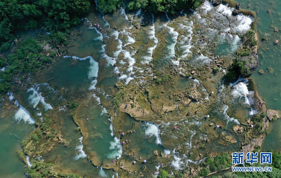 8月6日,游人在广西柳州市鹿寨县中渡镇响水瀑布景区里戏水游玩(无人机照片)。 连日来,广西柳州市持续高温天气,柳州市鹿寨县中渡镇响水瀑布景区成为人们休闲避暑的好去处,人们亲水游玩,享受清凉。 新华社发(黎寒池 摄)