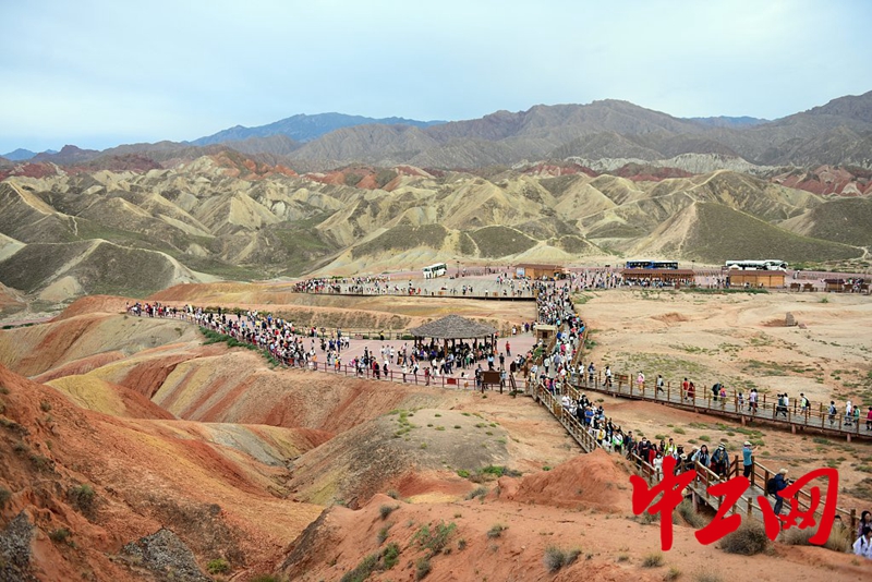 2020年8月7日,甘肃张掖,大批游客在七彩丹霞景区观光游览。蒙钟德/视觉中国