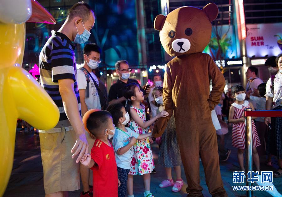 8月8日晚,小朋友在望京小街商业街与人偶互动。 当日,作为北京消费季活动的一部分,北京市朝阳区的“潮朝阳”消费季活动正式重启,位于朝阳区的新兴商业街望京小街举办开街嘉年华活动。 新华社记者 陈钟昊 摄
