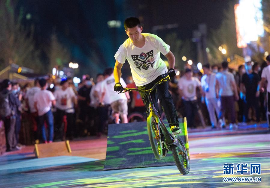 8月8日晚,自行车特技表演在望京小街商业街上演。 当日,作为北京消费季活动的一部分,北京市朝阳区的“潮朝阳”消费季活动正式重启,位于朝阳区的新兴商业街望京小街举办开街嘉年华活动。 新华社记者 陈钟昊 摄
