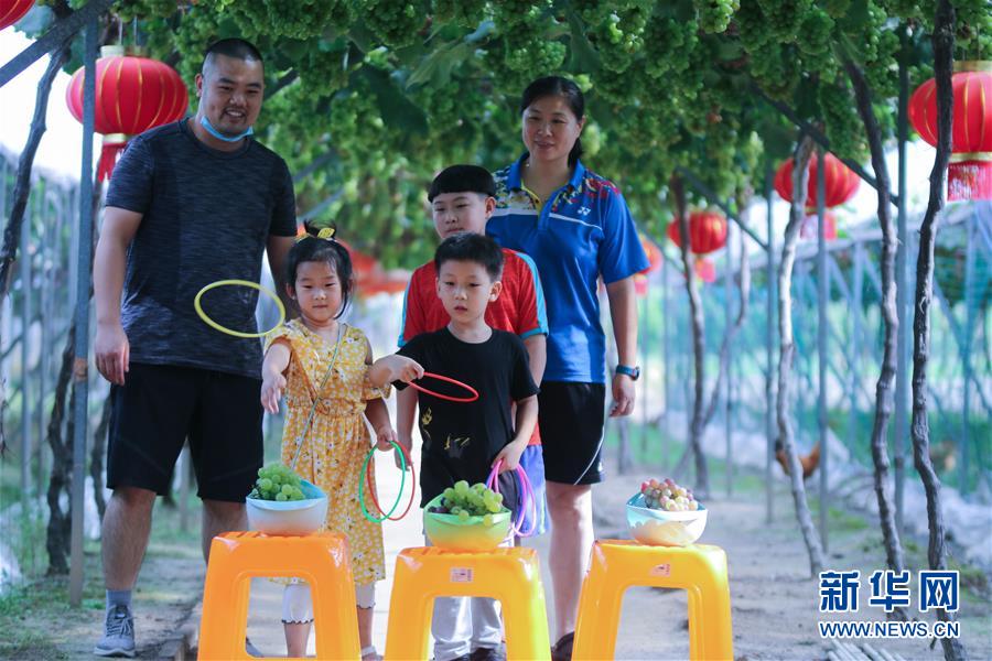 8月8日,在杭州富阳区东洲街道陆家浦村的千亩葡萄种植园内,游客在参加小游戏活动。
