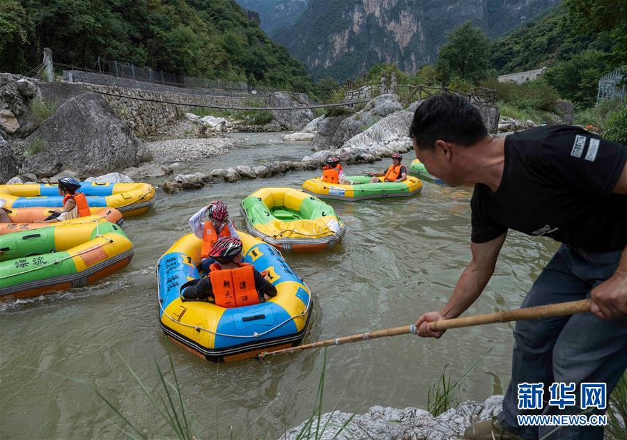 8月8日,安全救生员在朝天吼漂流景区矫正橡皮筏漂流航向。 近日,湖北A级景区对全国游客免门票开放,兴山县朝天吼漂流景区的免费漂流项目吸引不少游客。景区采取错峰调配,高密度增派安全救生员等措施,保障漂流体验安全舒适。 新华社记者 杜华举 摄