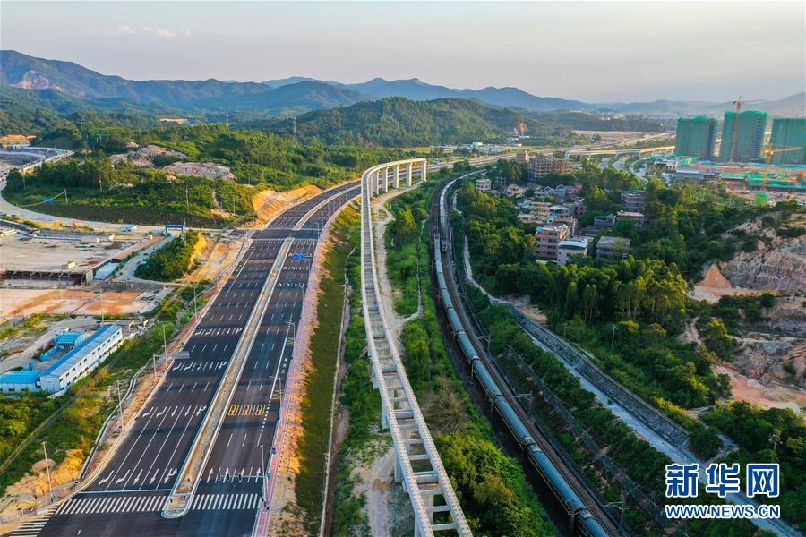 清远磁浮旅游专线修抵终点站长隆主题公园站,在该磁浮线旁边就是京广线铁路(8月9日摄,无人机照片)。新华社记者刘大伟摄