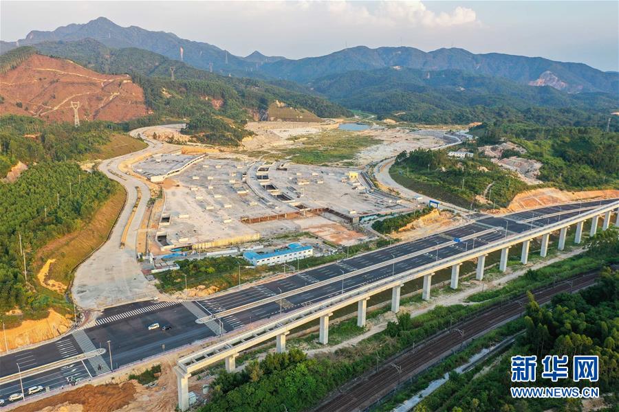 清远磁浮旅游专线修抵终点站长隆主题公园站,在该磁浮线旁边就是京广线铁路(8月9日摄,无人机照片)。新华社记者刘大伟摄