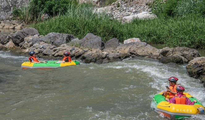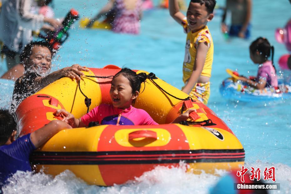 8月10日,小朋友在北京燕子湖水乐园戏水冲浪,乐享暑期时光。中新社记者 赵隽 摄