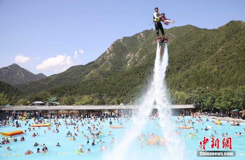 8月10日,小朋友在北京燕子湖水乐园体验“水上飞人”项目,乐享暑期时光。中新社记者 赵隽 摄