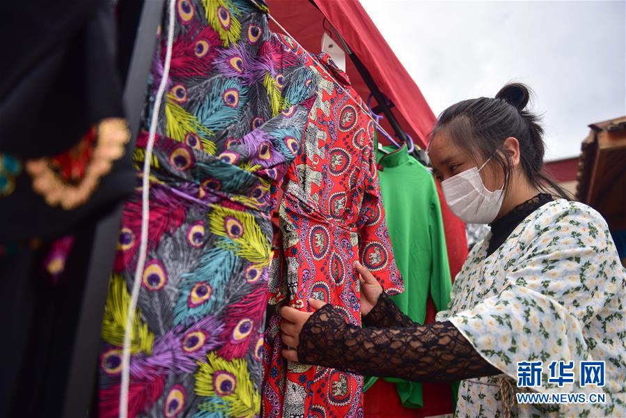 8月11日,尖扎县昂拉乡德吉村村民在自家经营的藏装店内整理服装。新华社记者 张龙 摄