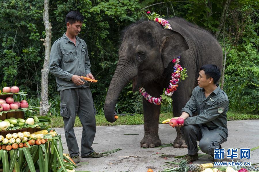 8月12日,在西双版纳傣族自治州亚洲象种源繁育及救助中心,两名“象爸爸”在喂救助象“羊妞”吃“生日蛋糕”。 新华社记者 陈欣波 摄