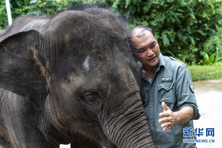 8月12日,在西双版纳傣族自治州亚洲象种源繁育及救助中心,一名“象爸爸”在和救助象“羊妞”互动。 新华社记者 陈欣波 摄