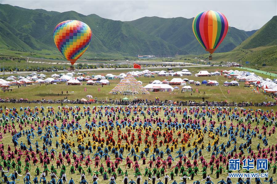 8月12日,身着节日盛装的演员和当地群众在夏泽滩草原上跳起锅庄舞。 当日,2020中国碌曲锅庄舞展演暨甘南藏族自治州第六届少数民族传统体育运动会在甘肃省甘南州碌曲县夏泽滩草原上举行。开幕式上,三千余名身着节日盛装的演员和当地群众在草原上起舞,雨后初晴的草原上充满欢声笑语。 新华社记者 黄泽民 摄