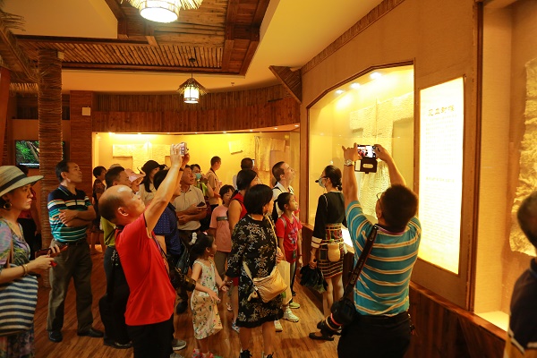 “‘黎族纺染织绣技艺’是世界级非物质文化遗产,传承非遗文化首先要了解这里的民族文化……”在黎锦坊,黎族最后一代绣面文身阿婆专注织锦的情景吸引了大家的目光,美轮美奂的图纹,原汁原味的田园气息,就像穿越千年的历史画卷铺展开来,让来宾们不由得竖起大拇指说“波隆!(真棒)”,为老人精湛的手工技艺点赞。