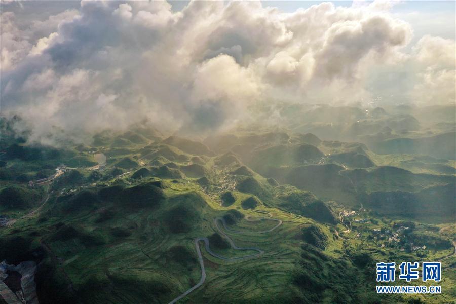 夕阳下的韭菜坪风光(8月19日摄,无人机照片)。 近日,贵州省韭菜坪景区内云蒸霞蔚,野生韭菜花次第开放,芬芳四溢,呈现出一幅美丽的自然画卷。 新华社记者 刘续 摄