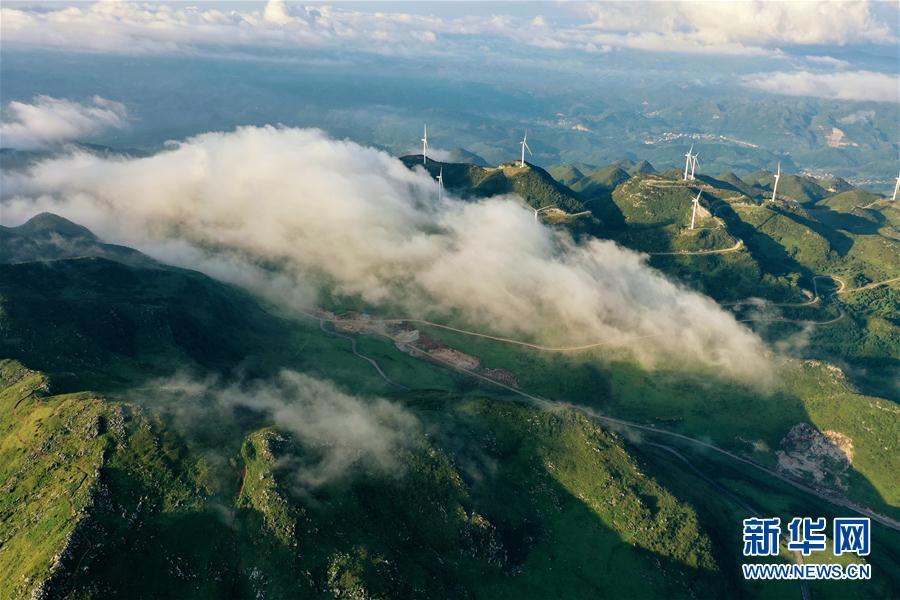 韭菜坪上风力发电设备被云雾环绕(8月19日摄,无人机照片)。 近日,贵州省韭菜坪景区内云蒸霞蔚,野生韭菜花次第开放,芬芳四溢,呈现出一幅美丽的自然画卷。 新华社记者 刘续 摄