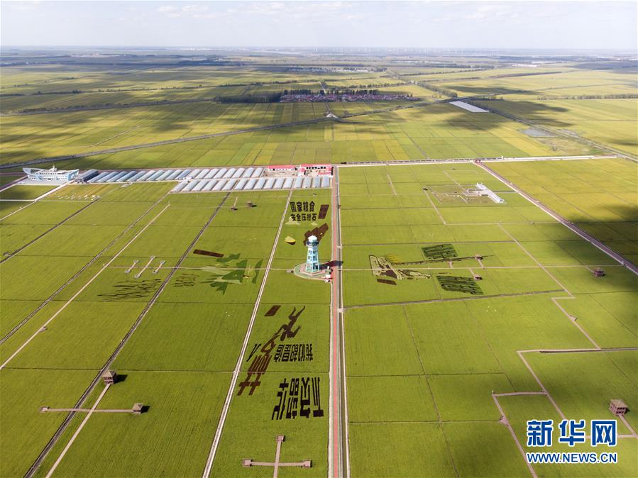 这是8月21日拍摄的富锦市万亩水稻公园中的稻田画(无人机照片)。 在黑龙江省富锦市万亩水稻公园,大地为纸,水稻为墨,一幅幅稻田画在大地上徐徐展开。该水稻公园建于2017年,是黑龙江省首个田园综合体项目的核心景点。 新华社发(张涛 摄)