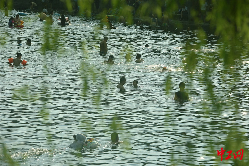 2020年8月23日,游客和村民带着孩子在杭州萧山区戴村镇沈村天然泳池里戏水享受清凉。龙巍/视觉中国