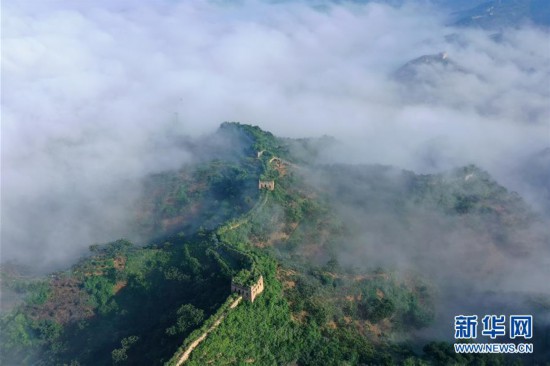 这是8月25日拍摄的河北省迁西县榆木岭长城云海景观(无人机照片)。 当日,河北省迁西县境内的古长城出现云海景观,古长城与云海、山峦交相辉映,美如画卷。 新华社记者 牟宇 摄