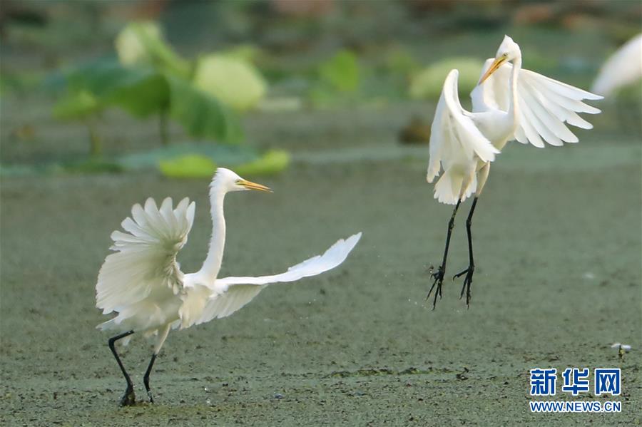 8月24日,在江苏省盱眙县马坝镇,白鹭在一处湿地上飞舞、觅食。 新华社发(颜怀峰 摄)