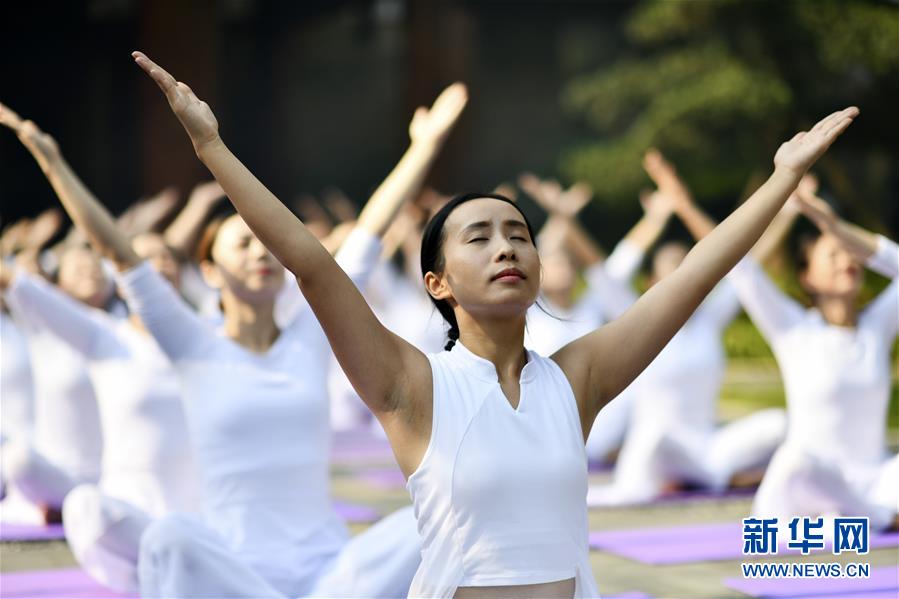 8月30日,瑜伽爱好者们在进行瑜伽展示。 8月30日,贵州省黔东南苗族侗族自治州剑河县的瑜伽爱好者们来到剑河温泉景区参加瑜伽展示活动。 新华社记者杨文斌摄