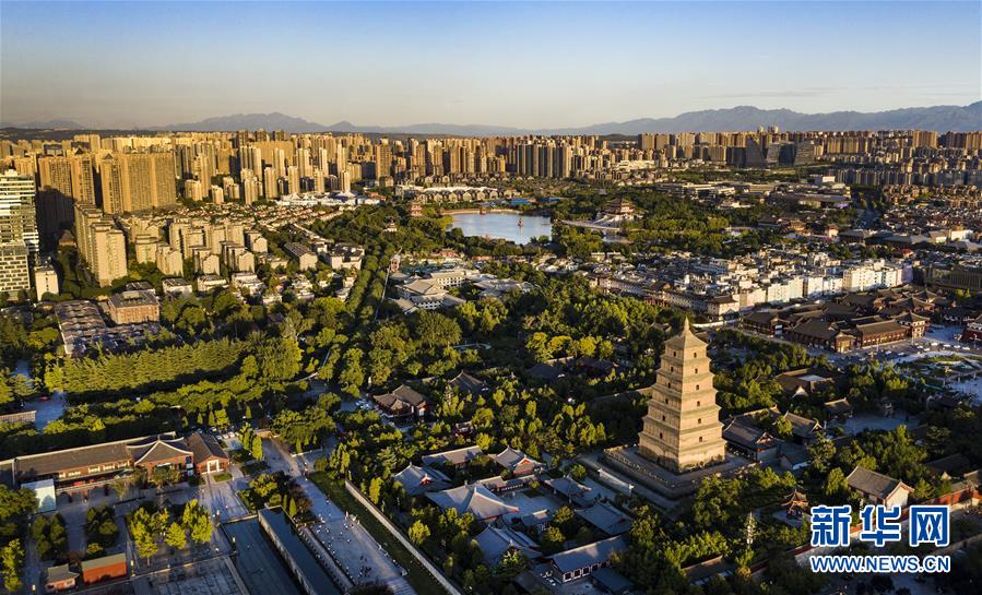 夕阳下的西安大雁塔(8月31日摄,无人机照片)。连日阴雨后,古城西安迎来好天气,远处的秦岭终南山清晰可见。新华社记者 陶明 摄