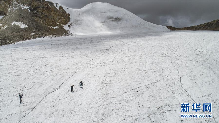 在廓琼岗日冰川公园内,游客正在体验攀冰乐趣(8月30日摄,无人机照片)。 廓琼岗日冰川公园位于西藏当雄县格达乡境内,海拔约5500米,距拉萨约160公里,是一处集冰川、雪山、湖泊、草甸于一体的独具特色的自然生态旅游区。在公园内,游客可以与冰川近距离接触,并可亲身体验攀登的乐趣。 新华社记者 孙非 摄