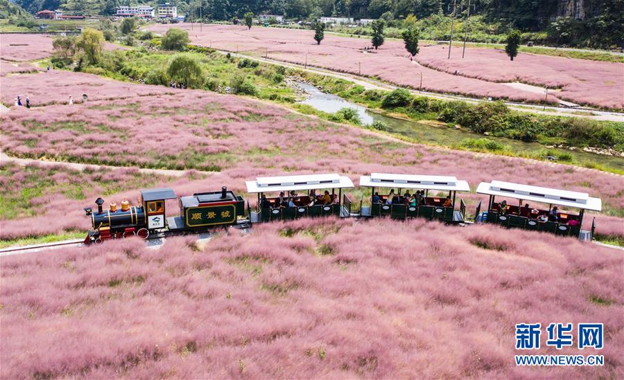 9月2日,游客在长顺县神泉谷景区内乘坐观光小火车游览(无人机照片)。 近日,贵州省黔南布依族苗族自治州长顺县神泉谷景区内的粉黛乱子草进入盛开期,成片的“粉色海洋”吸引众多游客前来观赏游玩。 新华社记者 陶亮 摄