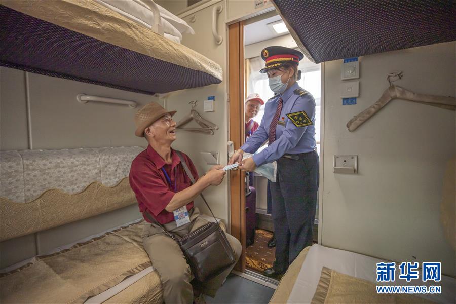 9月8日,在重庆北站,列车工作人员为搭乘跨省旅游专列的旅客发放口罩。 当日,一列搭乘270名游客的列车从重庆北站驶出,沿途将停靠西宁、敦煌、张掖、中卫、银川,并于9月17日返回重庆北站。这是重庆客运段在做好常态化疫情防控的前提下,为满足旅客需要开行的今年首趟跨省旅游专列。 新华社记者 黄伟 摄