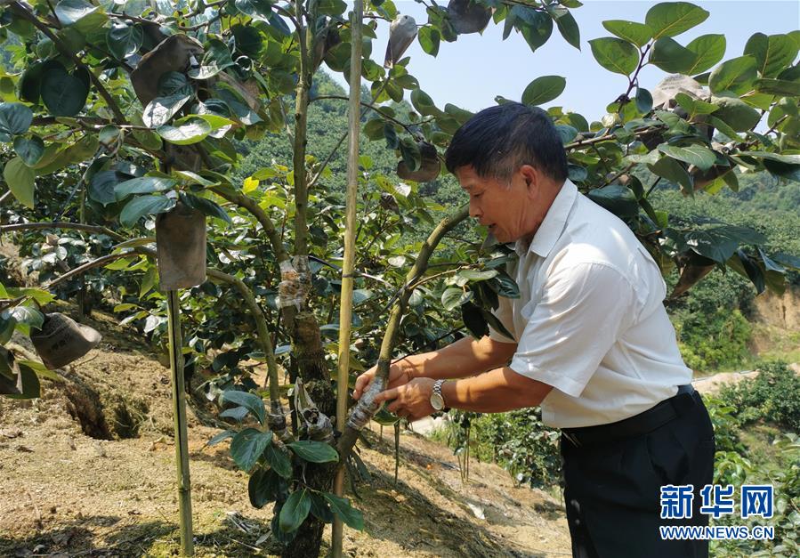 兰洞村党支部书记李强碧在果园里查看柿子树的生长情况(9月1日手机拍摄)。 从县城出发,汽车沿盘山公路前行,爬上当地人称“五层楼”的山梁,再蜿蜒而下,就到了山坳中一个绿树环绕的小山村——广西恭城瑶族自治县莲花镇兰洞村。村寨四周是漫山遍野的柿子树,万绿丛中,成熟的柿子沉甸甸挂满枝头,丰收的味道越来越浓。 新华社记者 王念 摄