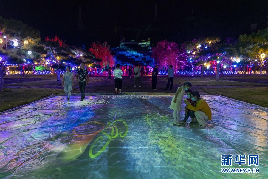 9月14日晚,游客在湖北武当山玉虚宫景区观赏光影秀。 大规模光影秀“玄岳之光”于近日在武当山玉虚宫开幕,古老的建筑与现代的声光电科技融合在一起,惊艳夜空。位于湖北省武当山景区的玉虚宫是武当山建筑群中最大的宫殿之一,始建于明永乐年间,规制谨严,院落重重。 新华社记者 杜华举 摄