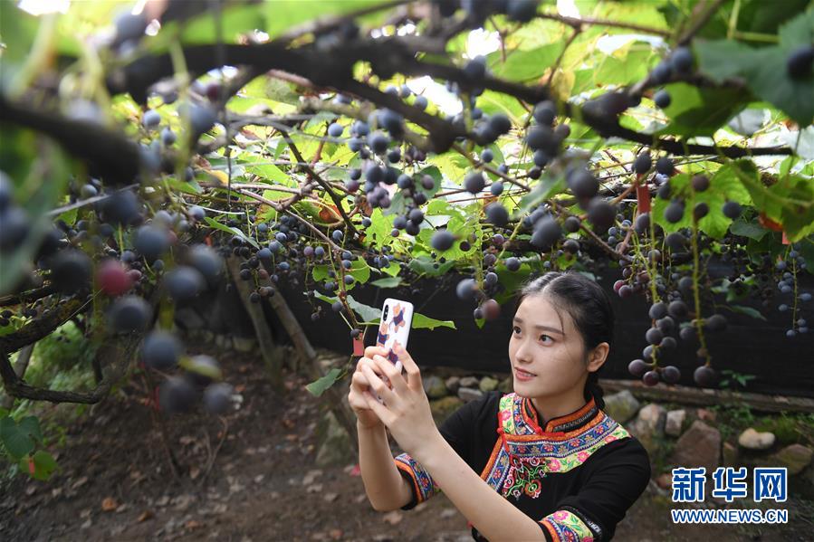 9月15日,在福建省宁德福安市穆云畲族乡溪塔村葡萄沟,一名姑娘身着畲族服饰在拍摄成熟的刺葡萄。新华社记者 宋为伟 摄