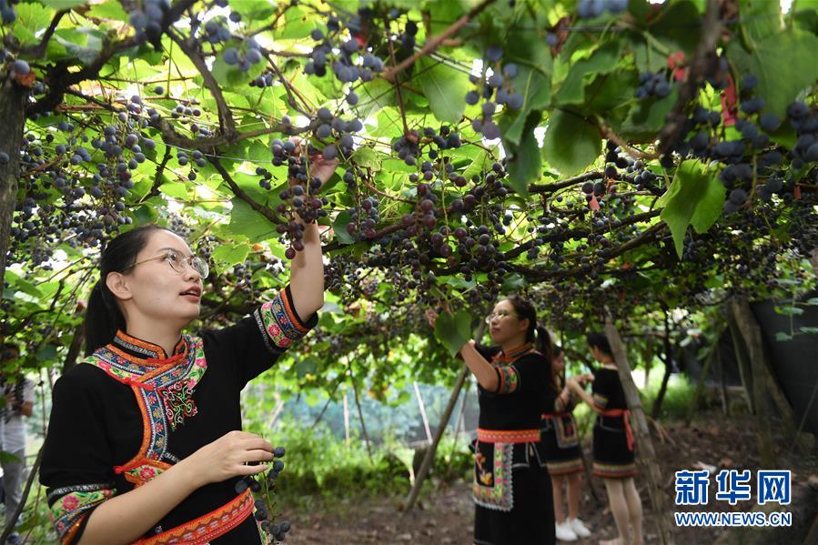 9月15日,在福建省宁德福安市穆云畲族乡溪塔村葡萄沟,几名姑娘身着畲族服饰在体验采摘刺葡萄。新华社记者 宋为伟 摄