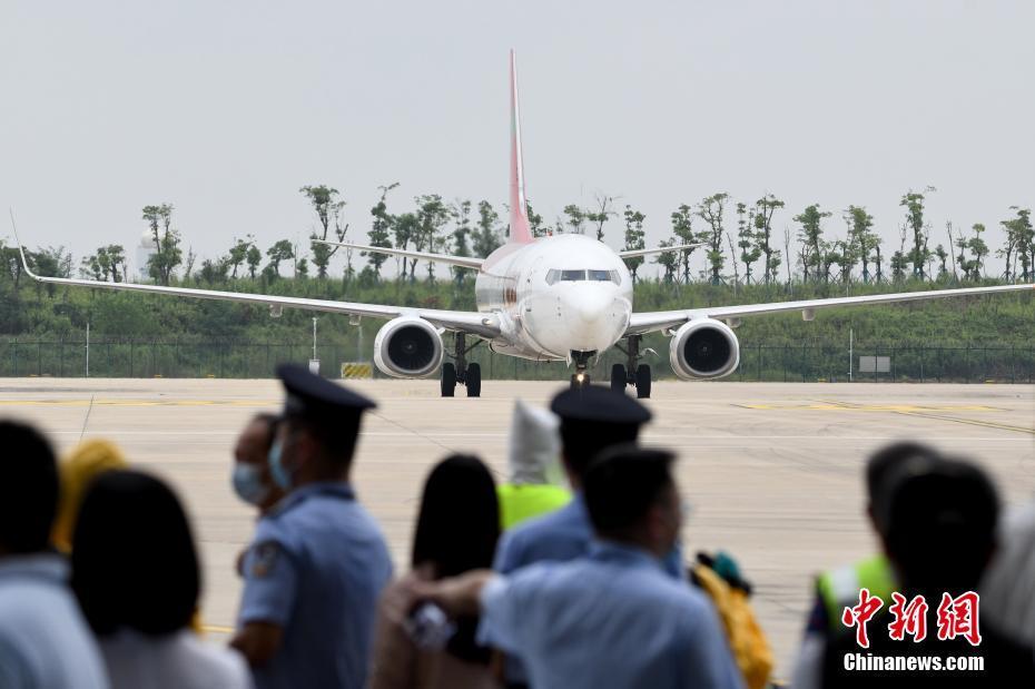 9月16日,由韩国德威航空公司执飞的波音B737-800客机搭载着60名乘客,降落在武汉天河国际机场。因新冠肺炎疫情停飞的韩国仁川至中国武汉往返航班当日正式复航,这也是自1月23日武汉天河国际机场国际及地区定期客运航班停运近8个月以来,恢复的首条国际客运航线。 中新社记者 张畅 摄