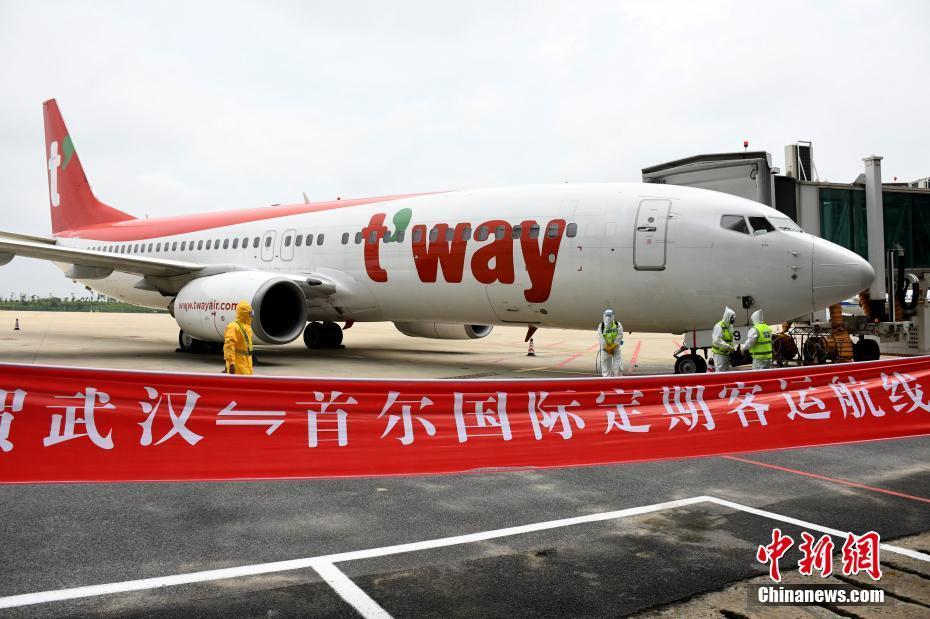 9月16日,由韩国德威航空公司执飞的波音B737-800客机搭载着60名乘客,降落在武汉天河国际机场。因新冠肺炎疫情停飞的韩国仁川至中国武汉往返航班当日正式复航,这也是自1月23日武汉天河国际机场国际及地区定期客运航班停运近8个月以来,恢复的首条国际客运航线。中新社记者 张畅 摄