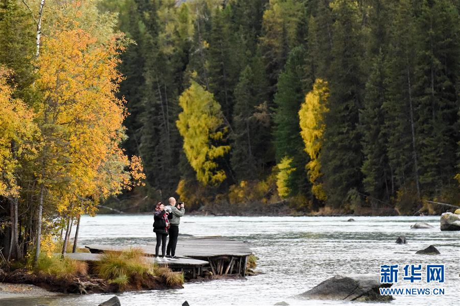 游客在新疆阿勒泰地区喀纳斯景区拍照(9月18日摄)。 时下正值新疆秋季旅游黄金季,且新疆跨省市旅游已全面开放,阿勒泰地区在做好常态化疫情防控工作的前提下,所有A级景区对全国游客实行免门票政策,并推出多项“交通+旅游”优惠政策和丰富多彩的文旅活动,推动旅游业加速升温。 新华社记者 丁磊 摄