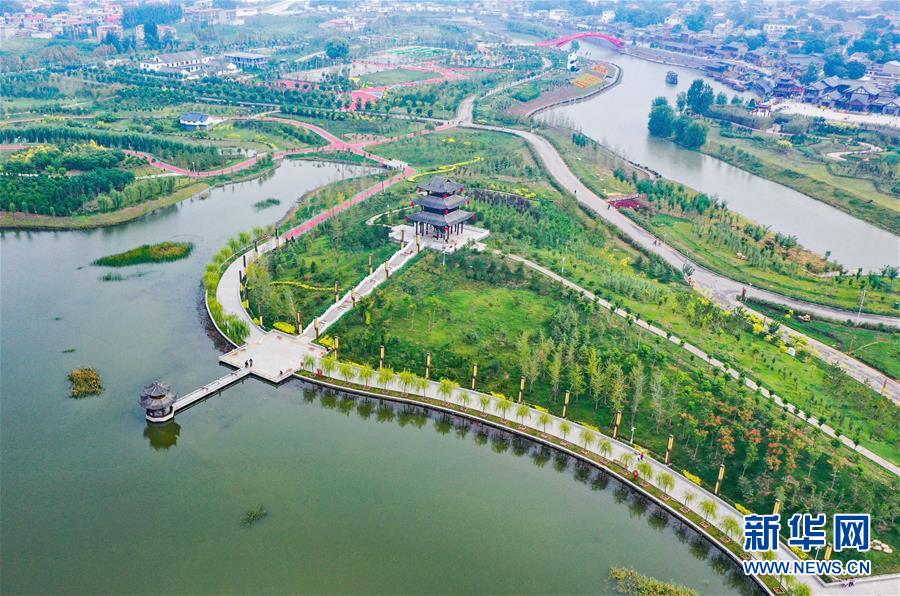 9月24日拍摄的磁县如意湖湿地生态公园(无人机照片)。 近年来,河北省邯郸市磁县加快环城水系建设,启动河流综合治理和生态修复,开展“清水绿岸”治理提升工作,通过新建和改造排水管网、清理河道淤泥等举措,打造河畅水清、岸绿景美、自然和谐的绿色河流生态空间。 新华社记者 王晓 摄