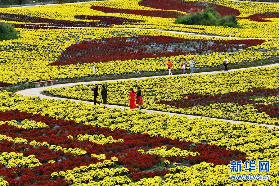 9月24日,游客在贵州省龙里县醒狮镇大岩村“龙湖花海”生态农业观光基地赏菊。 近日,在位于贵州省黔南布依族苗族自治州龙里县醒狮镇大岩村的“龙湖花海”生态农业观光基地,400余亩各色菊花陆续开放,吸引各地游客前来赏菊。 据了解,“龙湖花海”生态农业观光基地是大岩村“村社合一”经济实体之一,该基地以“党支部+农户+合作社”的形式,多渠道壮大村集体经济,持续巩固脱贫攻坚成果。 新华社记者 杨文斌 摄