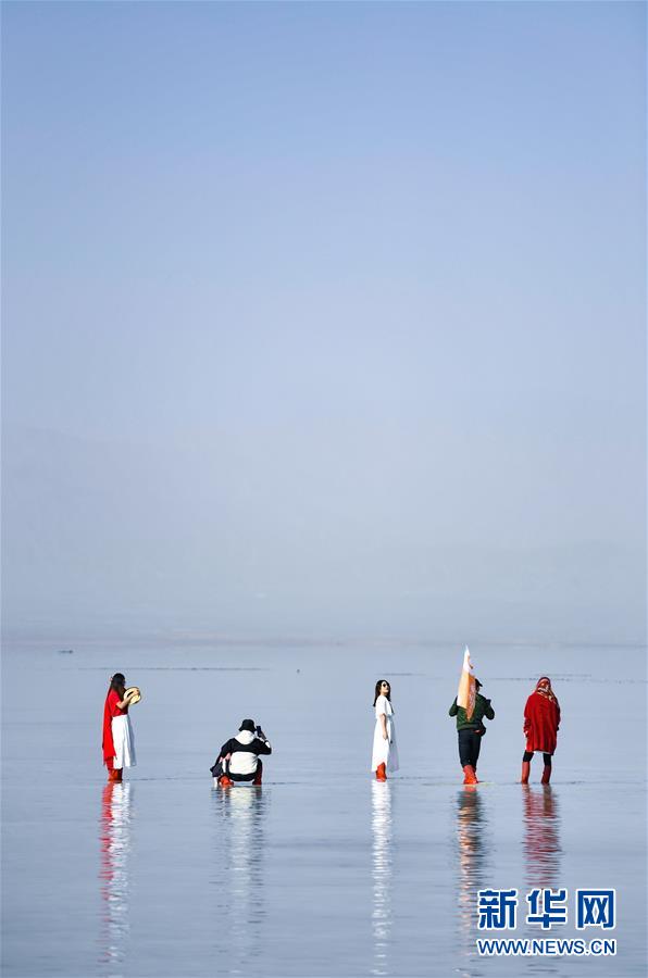 9月23日,游客在茶卡盐湖“天空之镜”景区游玩。新华社记者 张龙 摄