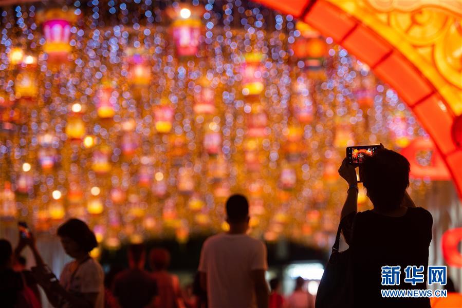 9月25日,市民在澳门议事亭前地拍摄节日灯饰。 国庆及中秋将至,澳门各主要街道、广场、公园及建筑物上布置了节日灯饰,佳节气氛浓厚。 新华社记者 张金加 摄