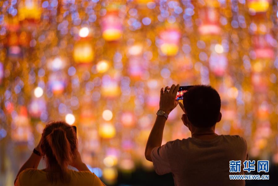 9月25日,市民在澳门议事亭前地拍摄节日灯饰。 国庆及中秋将至,澳门各主要街道、广场、公园及建筑物上布置了节日灯饰,佳节气氛浓厚。 新华社记者 张金加 摄