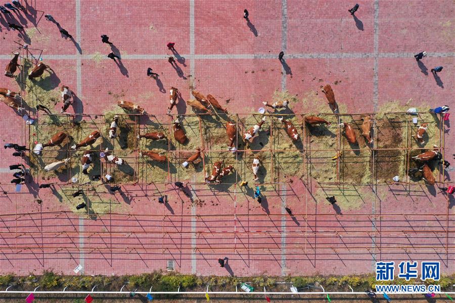 9月26日,牛群在首届内蒙古赛牛节上等待参加比赛(无人机照片)。新华社记者 徐钦 摄