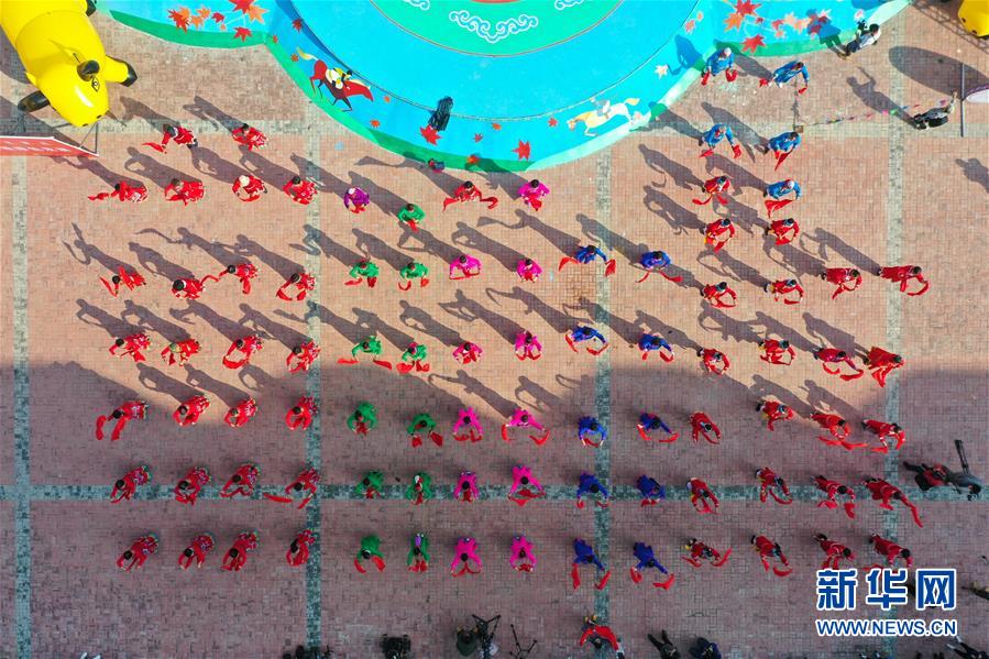 9月26日,舞者在首届内蒙古赛牛节开幕式上表演(无人机照片)。新华社记者 徐钦 摄