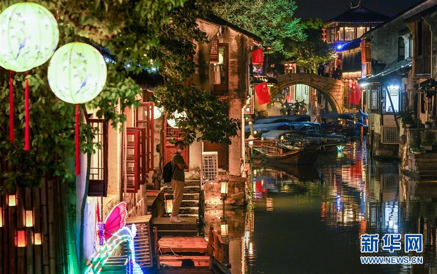 游客在灯光璀璨的水巷游览(9月27日摄)。新华社记者 杨磊 摄
