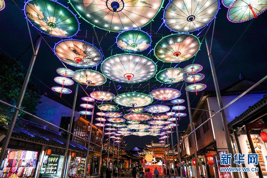 游客们在“烟雨江南”彩灯区游览(9月27日摄)。新华社记者 杨磊 摄