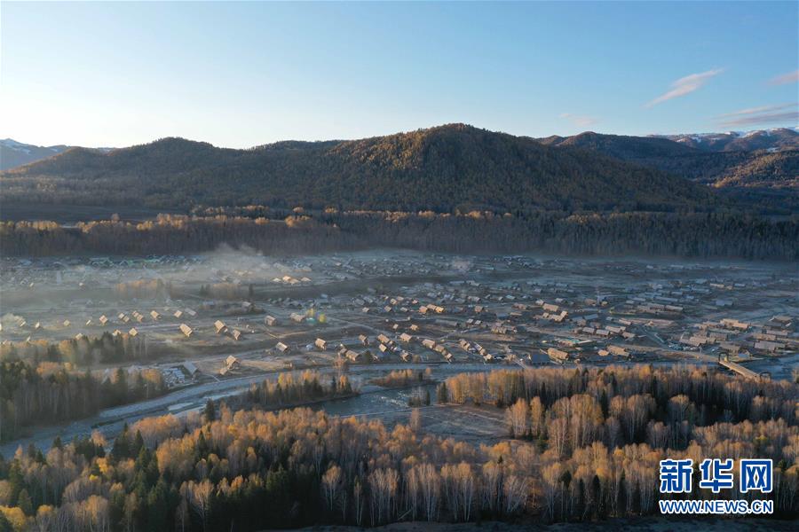 9月28日拍摄的禾木秋景(无人机照片)。 近日,新疆禾木迎来金秋最佳观赏时节,如画的秋景吸引了众多游客。 新华社记者 沙达提 摄